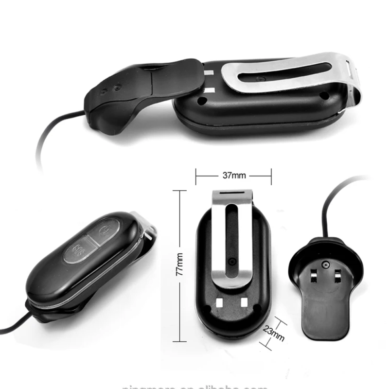 La pinza en el lateral sugiere que está diseñado para sujetarse fácilmente a la ropa, un cinturón o una correa.