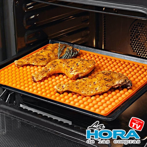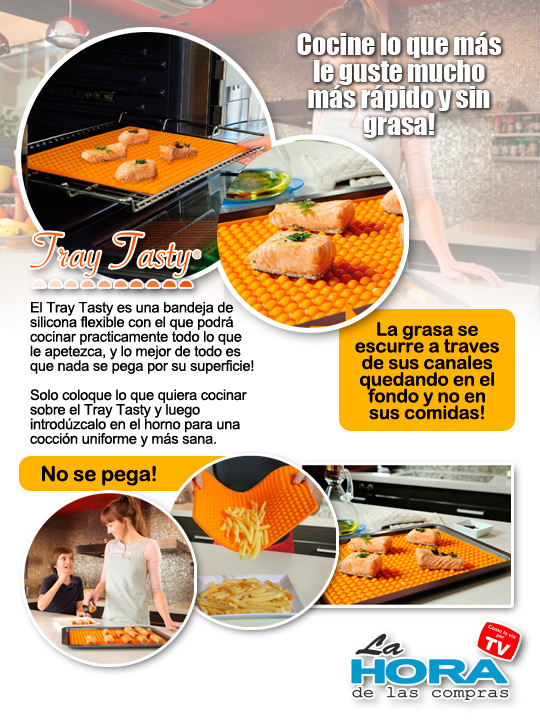 La bandeja Tray Tasty está fabricada en silicona flexible y resistente al calor, diseñada para cocinar alimentos al horno sin necesidad de darles la vuelta. Su superficie con cúpulas circulares permite que el aire caliente circule por debajo de los alimentos, logrando una cocción uniforme y crujiente. Ideal para carnes, vegetales, empanadas, nuggets, papas fritas y más. Es reutilizable, fácil de lavar y se guarda en cualquier espacio.