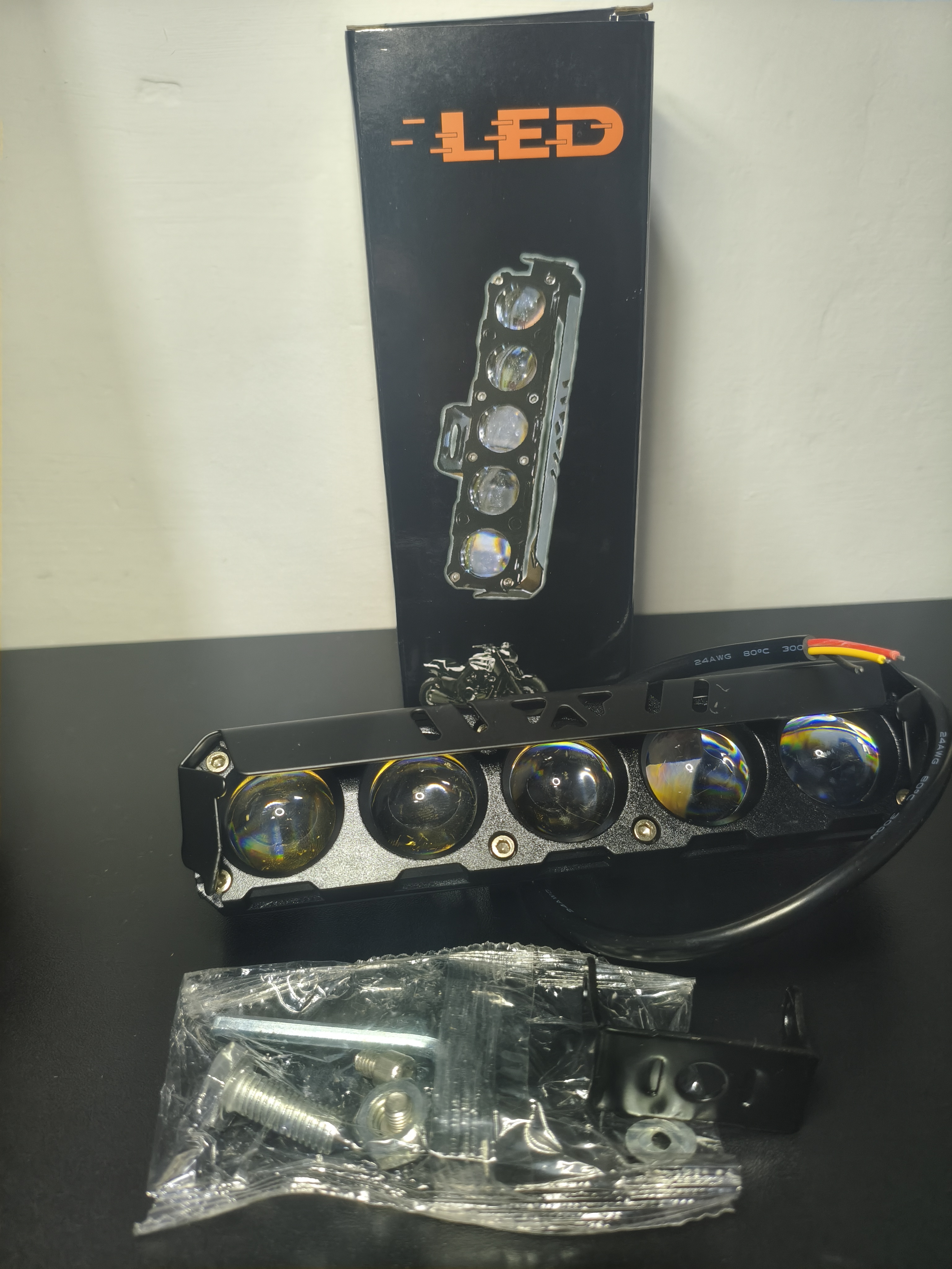 Trae de accesorio toda la tornillería, el soporte para la colocación mas la llave para los tornillos, tiene un gran profundidad en iluminación, contacto para cualquier consulta especifica: