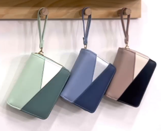 Cuenta con cierre metálico seguro, muñequera removible y compartimentos internos para billetes, tarjetas y monedas.