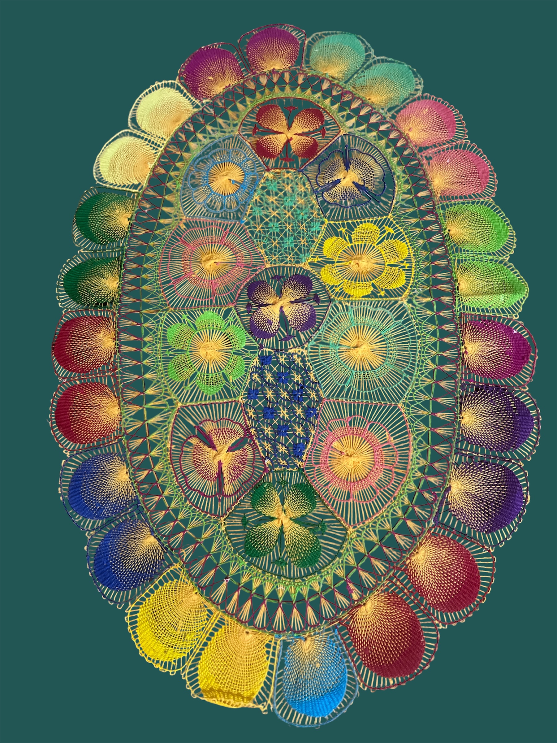 Elegancia y valor cultural de la artesanía tradicional paraguaya. Carpeton ovalado de Ñanduti hecho con finos hilos. Colores variados. Pieza decorativa para mesas y espacios especiales.