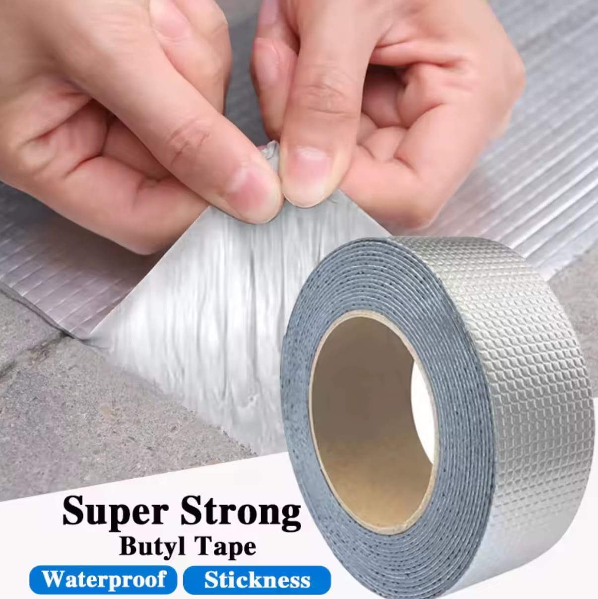La cinta de butilo impermeable, como la que se muestra en la imagen, es una cinta adhesiva súper fuerte y flexible diseñada para sellar y reparar fugas.
