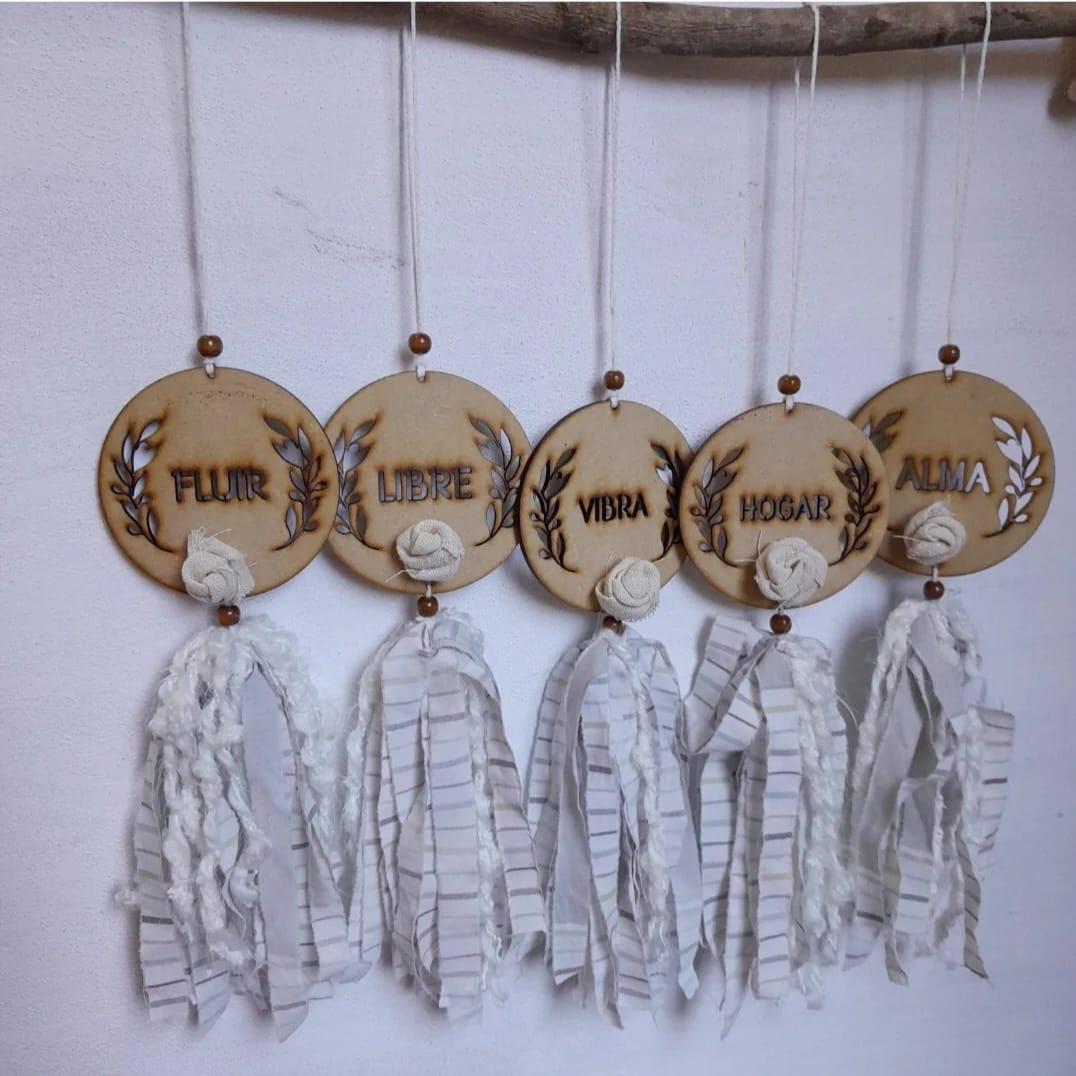 Estos colgantes en MDF llevan frases que alientan el corazón.