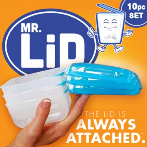 Descripción del producto: Mr. Lid Containers son contenedores de alimentos con tapa incorporada, diseñados para evitar pérdidas de tapas y mantener la organización. Fabricados en plástico libre de BPA, son herméticos, apilables, resistentes a fugas y aptos para microondas y lavavajillas. El set incluye múltiples tamaños para almacenar desde snacks hasta comidas completas.