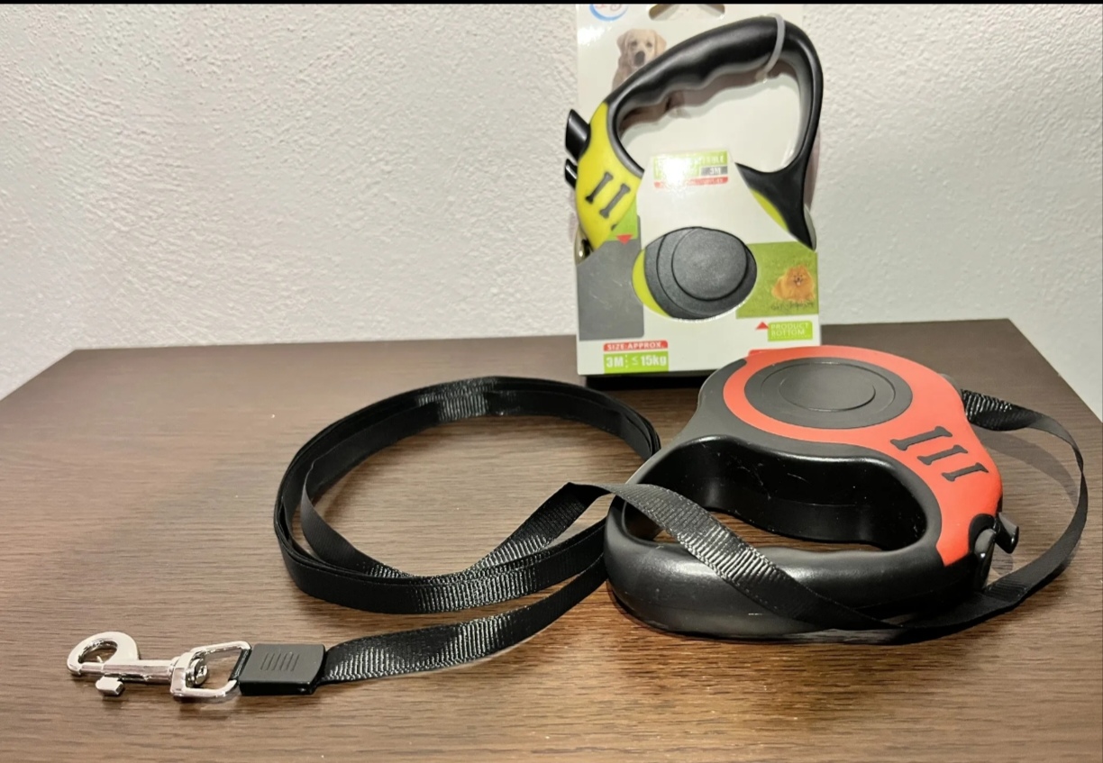 Estas son correas retráctiles para mascotas Abe pet, disponibles en colores rojo y amarillo.