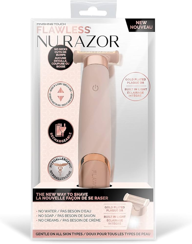 Descripción del producto: Flawless Nu Razor es una depiladora eléctrica recargable diseñada para ofrecer un afeitado suave, rápido y sin dolor. Su cabezal chapado en oro de 18 quilates es hipoalergénico y seguro para todo tipo de pieles. Funciona sin agua, jabón ni cremas, lo que la hace ideal para usar en cualquier momento y lugar. Incluye tecnología Sensaguard para proteger zonas sensibles como axilas, bikini, rodillas y tobillos. Su diseño portátil y elegante la convierte en una opción práctica para el cuidado personal diario.