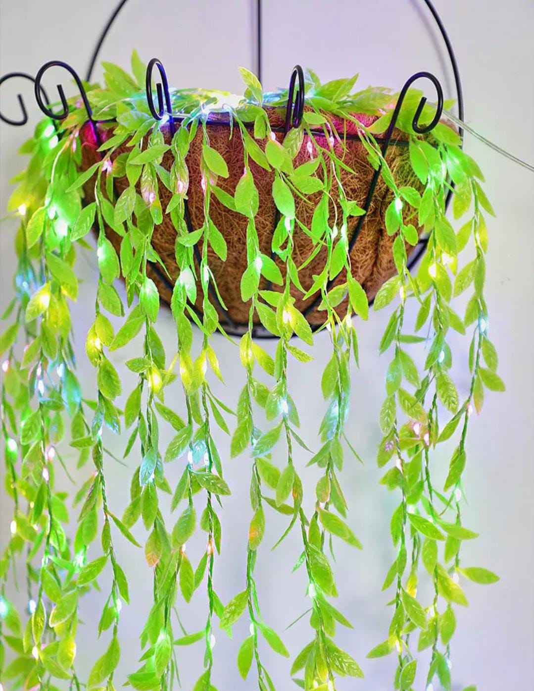 La imagen muestra una cortina o guirnalda de luces LED con hojas artificiales. Este producto es una decoración versátil que combina iluminación con elementos botánicos sintéticos para crear un ambiente natural y acogedor.
