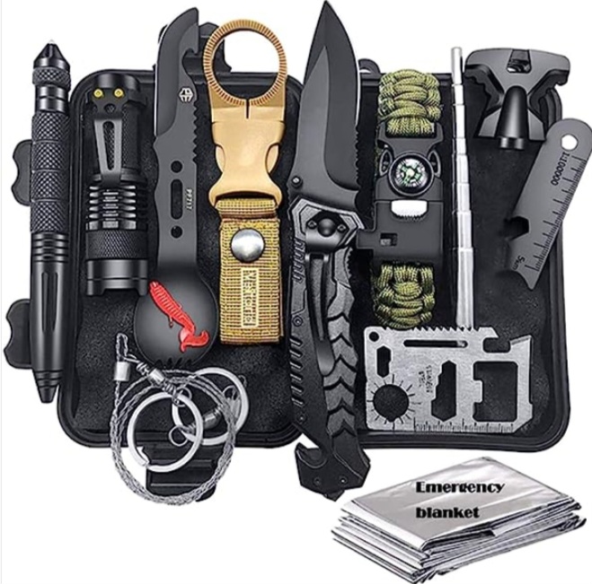 Equipo de supervivencia imprescindible: El kit de supervivencia y emergencia, 12 en 1, contiene: Cuchillo de supervivencia mejorado, fuelle de bolsillo, sierra de alambre, clip de botella de agua, manta de emergencia, rascador de piedra de pedernal, linterna, cuchillo de tarjeta de crédito, tenedor de cuchara multiusos, mosquetón y caja impermeable.