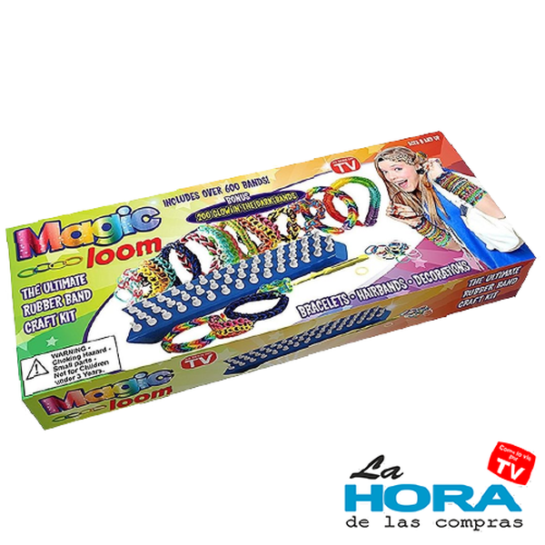 Descripción del producto: El Magic Loom Kit es un set creativo para fabricar pulseras, anillos, tobilleras y collares con bandas elásticas de colores. Incluye un telar plástico, ganchos, varita mágica y más de 600 gomitas no tóxicas en tonos vibrantes. Ideal para niños mayores de 5 años, estimula la motricidad fina, la creatividad y el diseño personalizado de accesorios.