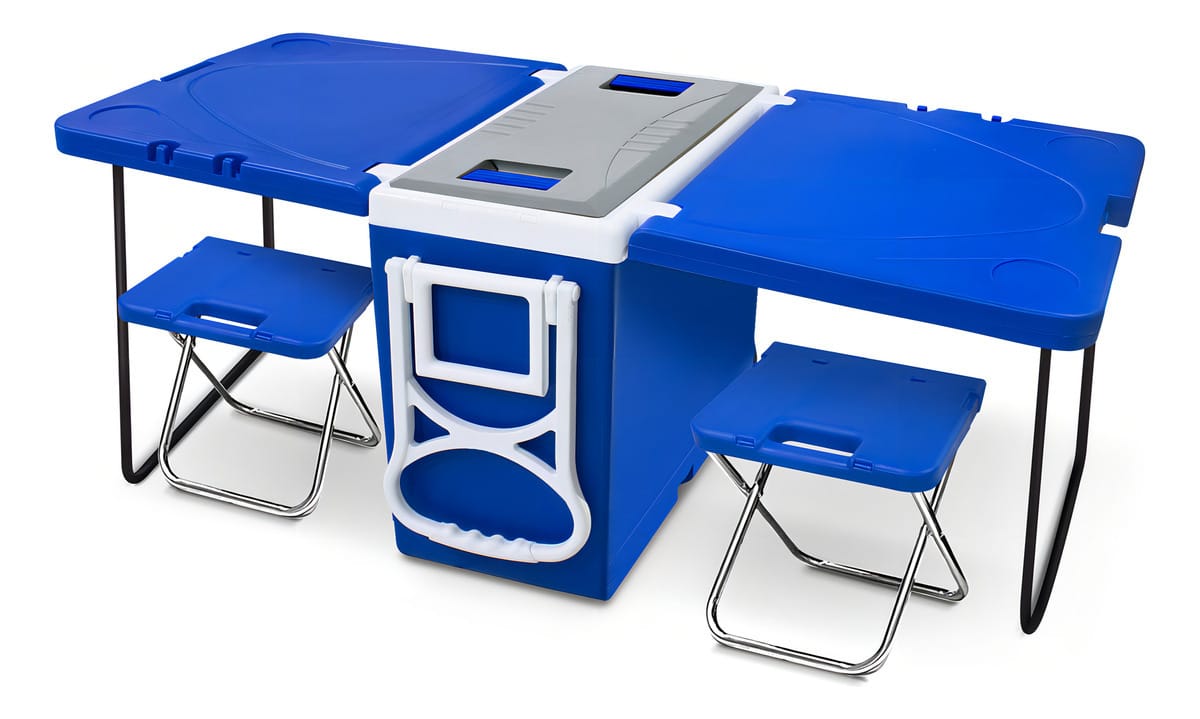 Viene con ruedas y manija para su fácil transporte, incluye dos banquetas y dos "mesitas" que le dan una excelente funcionalidad.