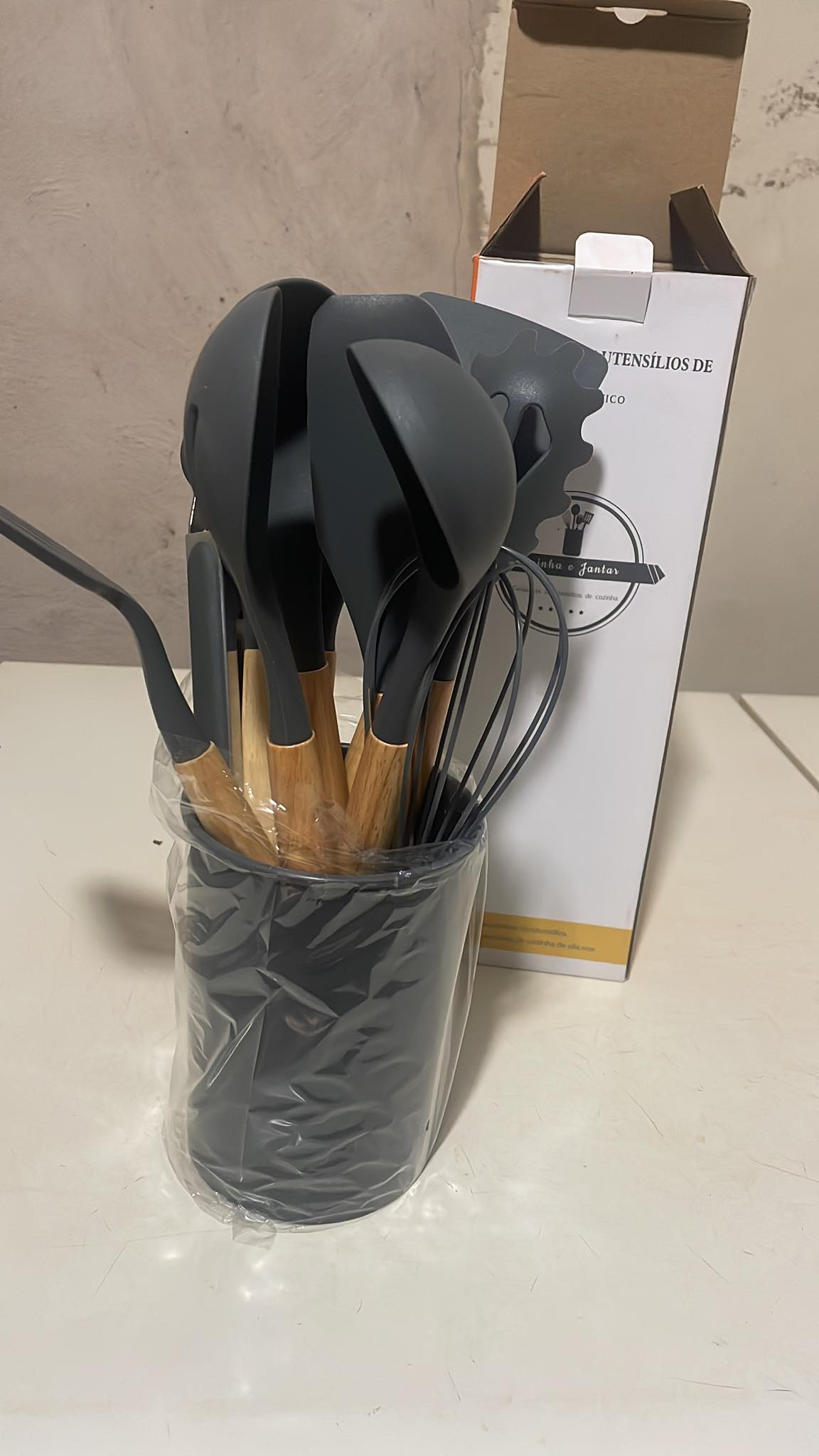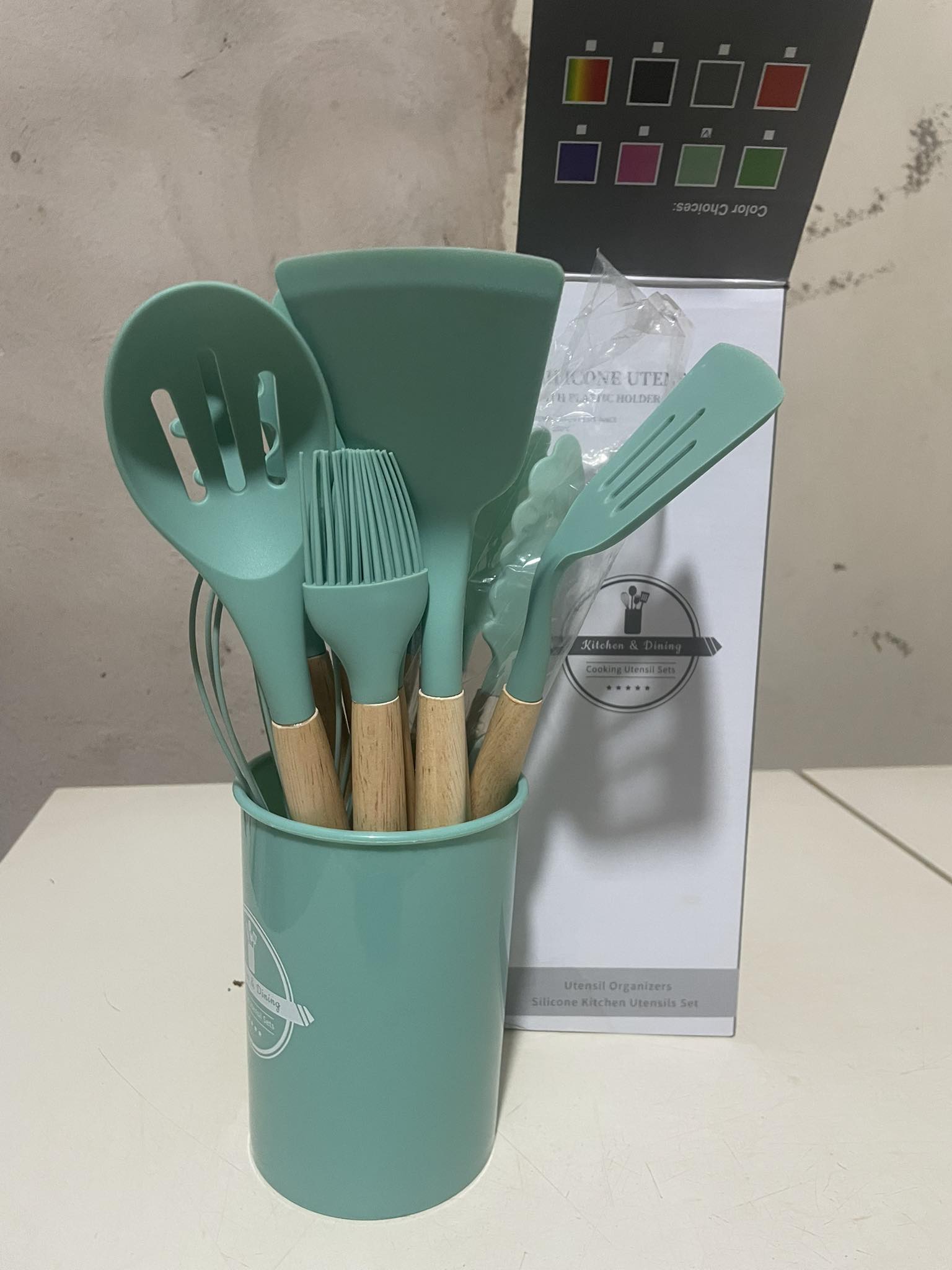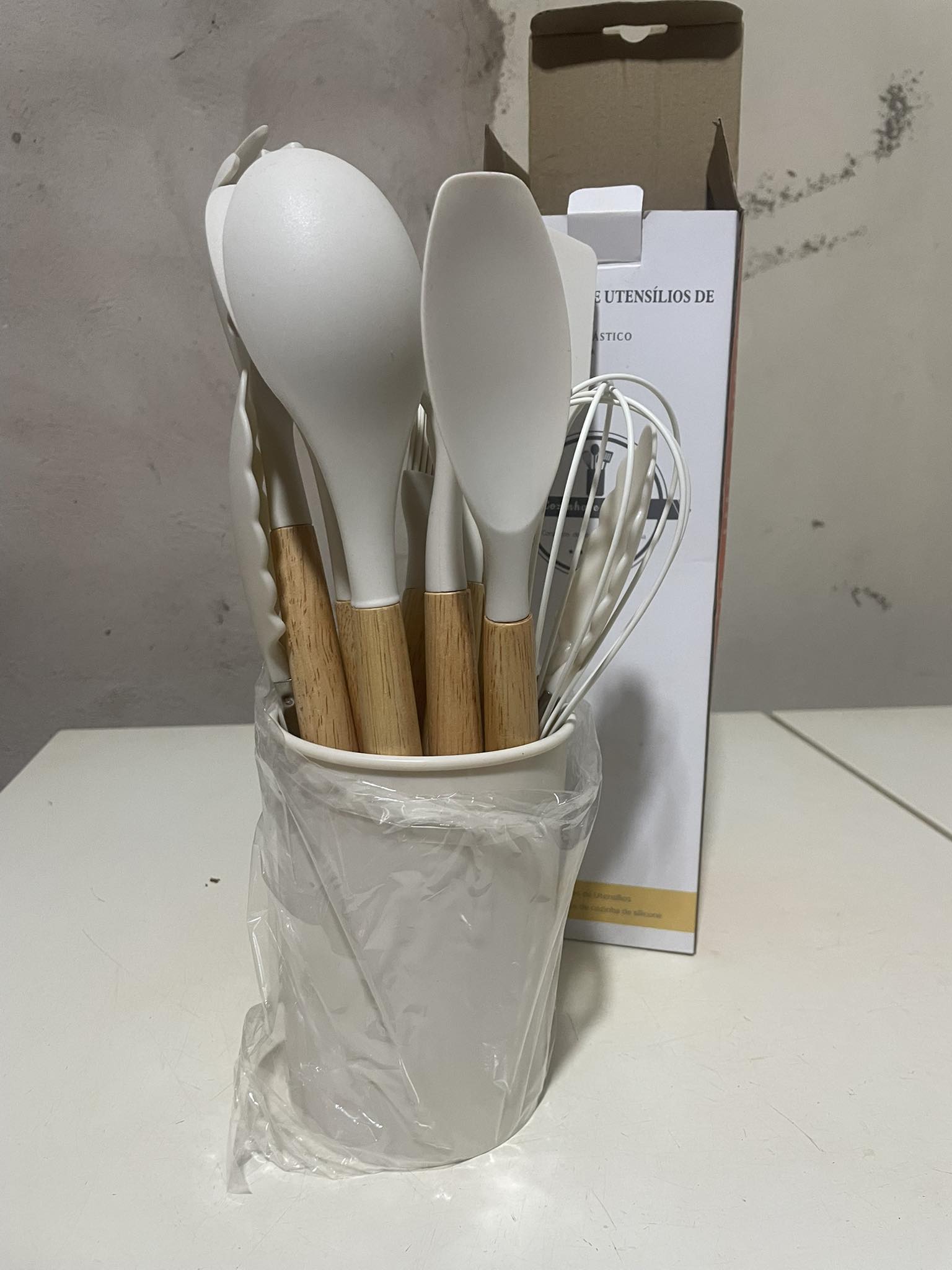 Set utensilios para cocina. Material: Silicona, mango de madera. Contiene 12 piezas.