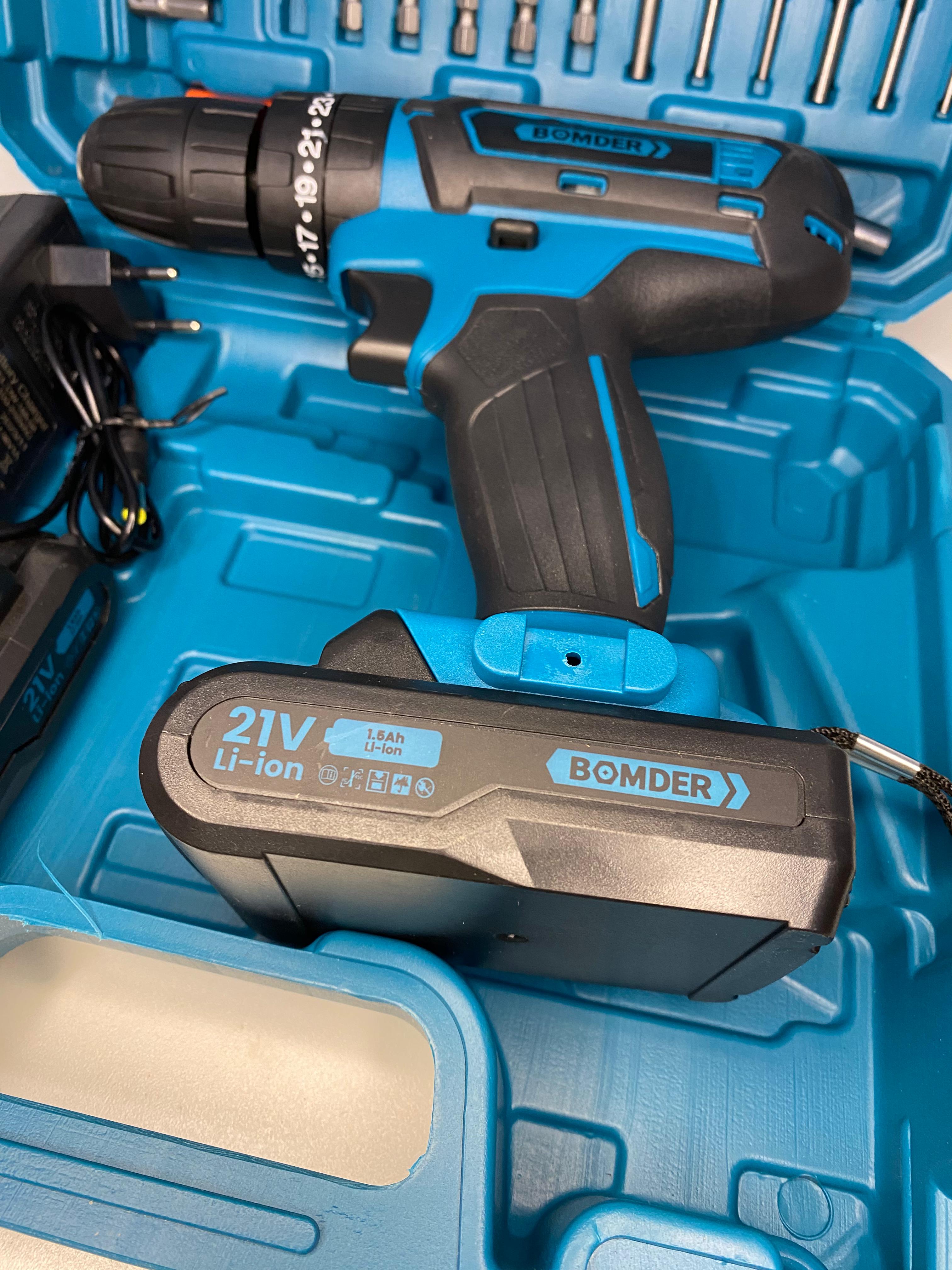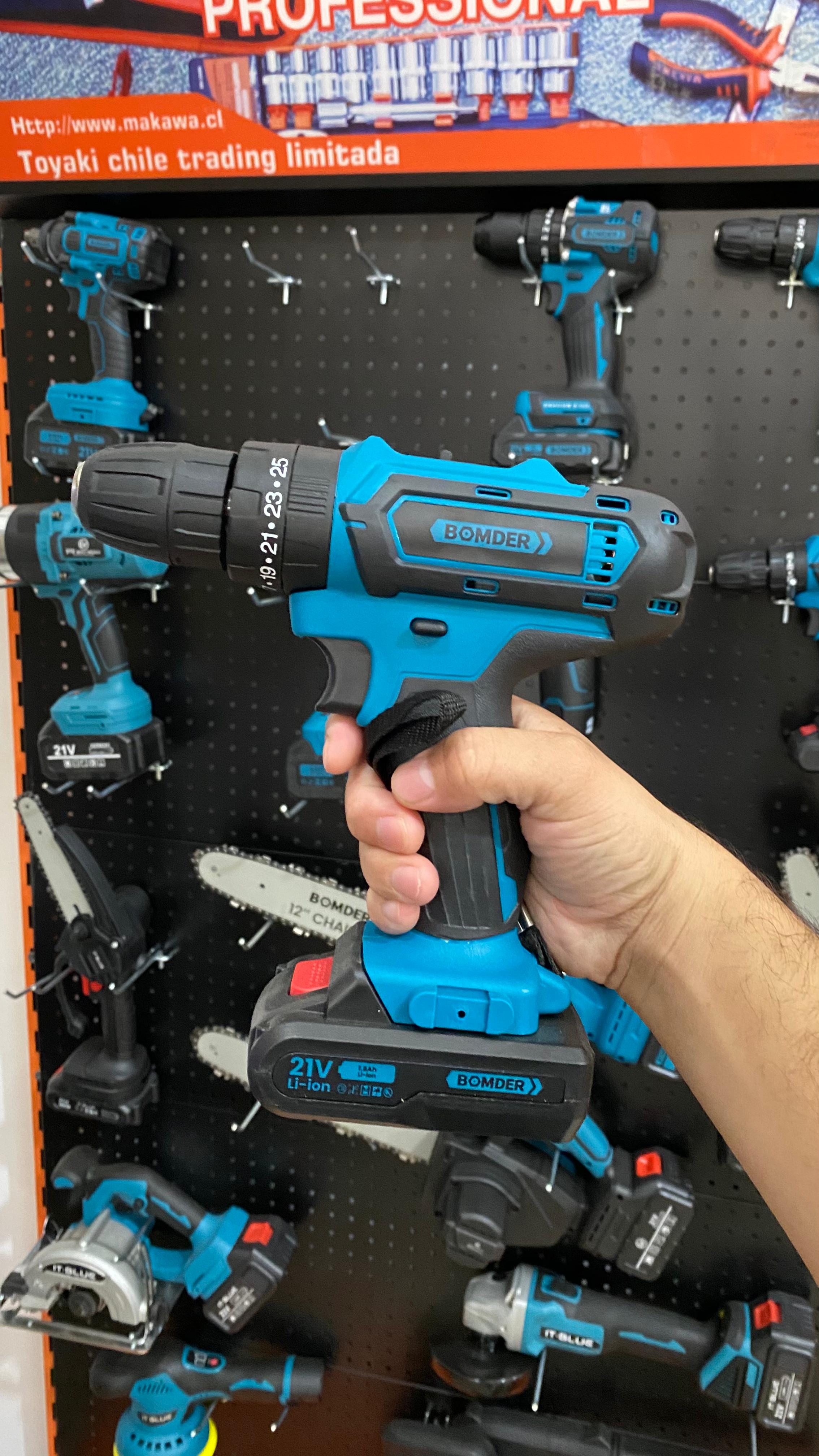 Taladro de 21 V, funciona como taladro, atornillador y percutor, incluye dos baterías, cargador, puntas y brocas, extensión flexible en su maletín resistente, sirve para pared, maderas, metal .