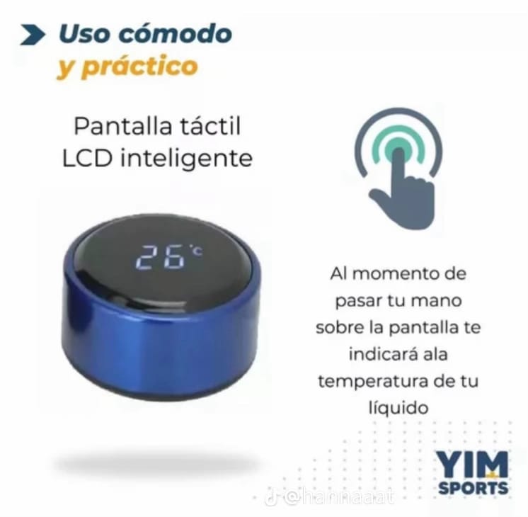 Pantalla LED táctil: integrada en la tapa, permite visualizar la temperatura del líquido interior con solo un toque. El sensor de temperatura digital se activa al presionar suavemente la pantalla, brindando una lectura precisa y rápida en grados Celsius.