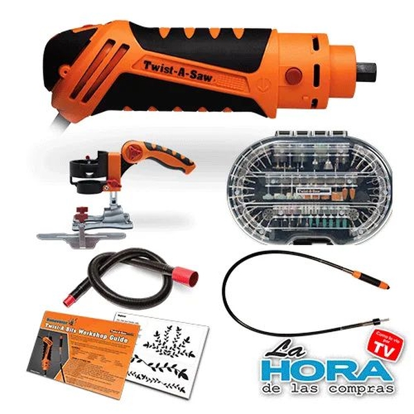 Twist-a-Saw Deluxe es una multiherramienta eléctrica versátil que permite cortar, lijar, grabar, tallar, pulir, afilar y más, todo con un solo equipo. Su diseño ergonómico y liviano facilita el manejo en trabajos de precisión o bricolaje. Incluye múltiples accesorios para adaptarse a distintos materiales como madera, metal, cerámica, acrílico y plástico. Ideal para reparaciones, remodelaciones, manualidades y proyectos creativos.