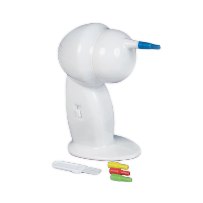 Colocar una boquilla limpia en el extremo del dispositivo. Encender el equipo y posicionar suavemente en la entrada del oído. Dejar actuar por unos segundos con movimientos circulares suaves. Apagar y retirar. Limpiar la boquilla y el filtro después de cada uso. No introducir profundamente ni usar con infecciones activas.